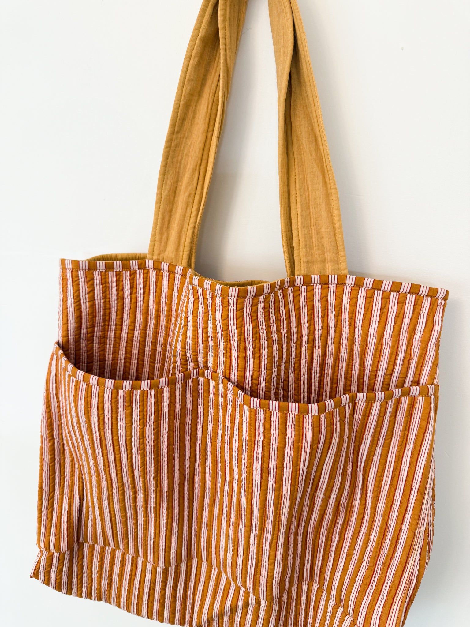 Our Giant Quilted Tote will forever be your go-to for the market, for a coffee date, and everything in between. Designed with parenthood in mind, there are five roomy pockets to carry all the things every day. On the solid color side, there are two giant side-by-side pockets that can be used for easy-to-grab wipes, diapers, your water bottle, and more. On the striped side, there are the same two giant side-by-side pockets along with one zipper pocket, which we call our important things pocket (wallet, jewelry, etc).