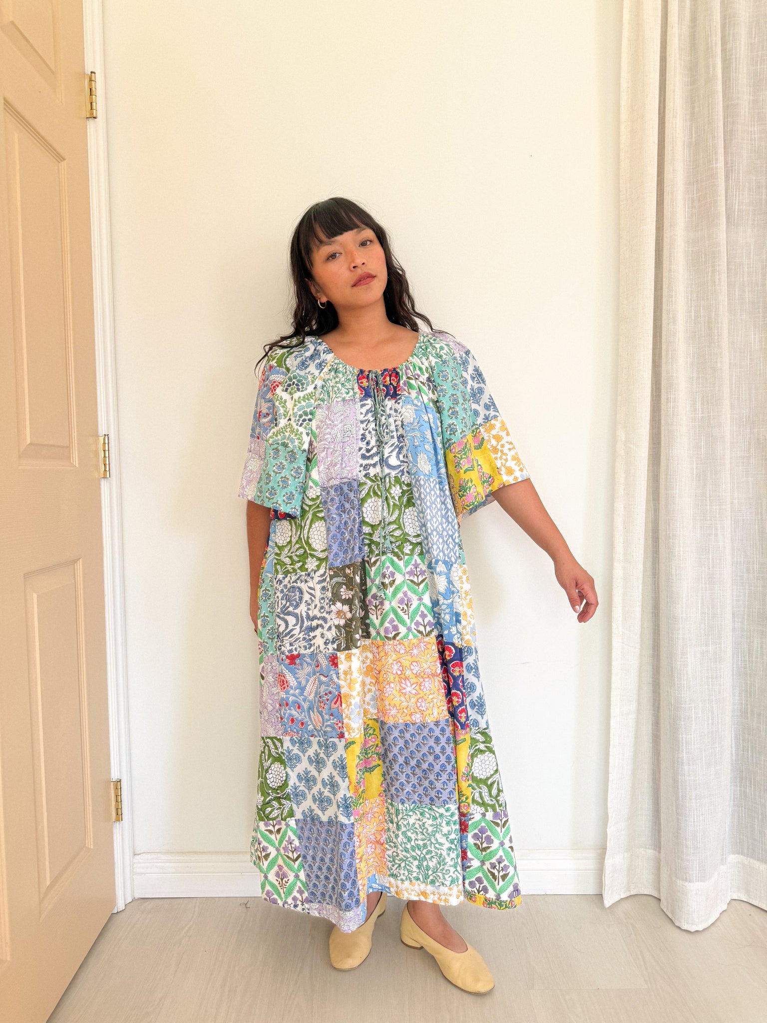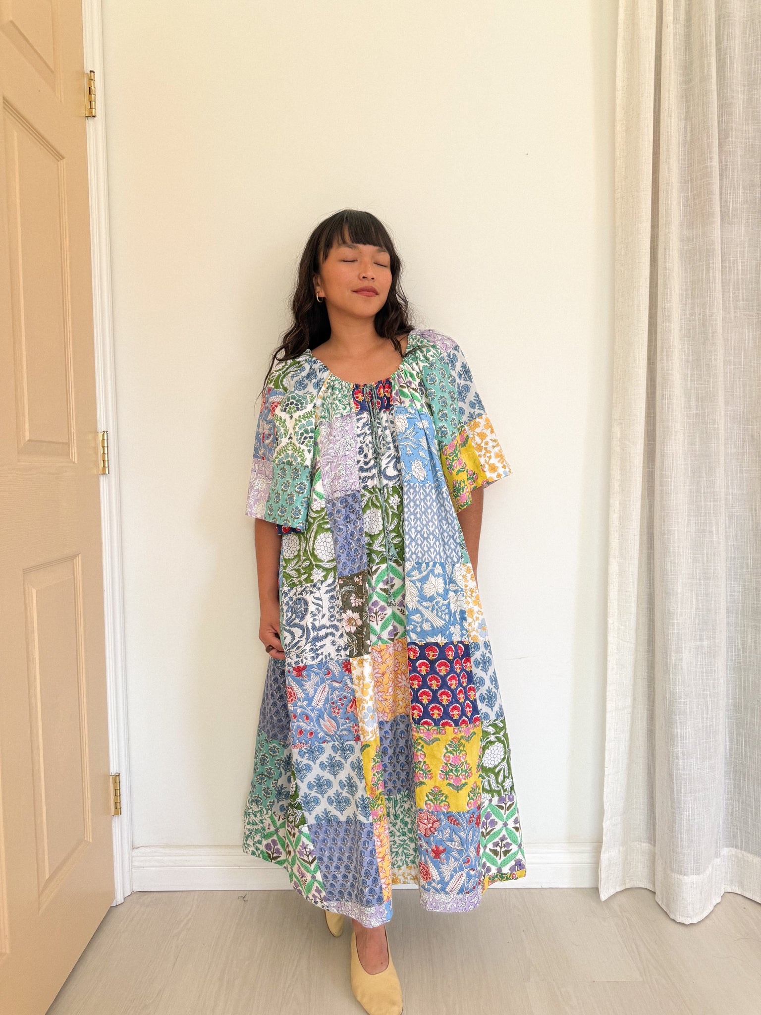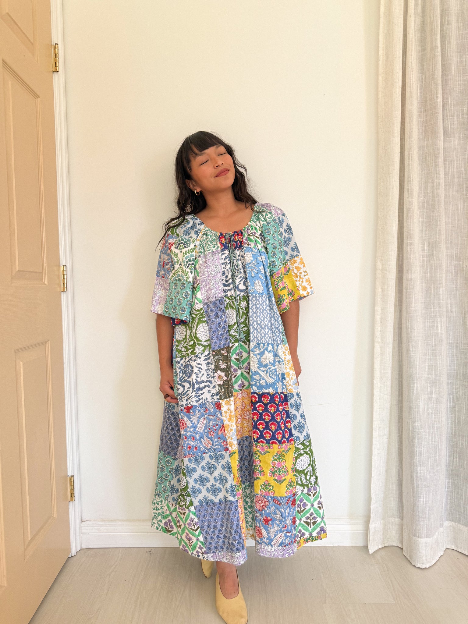 Patchwork Block Print: This has been created using leftover fabric. While all dresses in this colorway will be similar in colorful patchwork, each dress will be different given the nature of using leftover fabric. No dress will be exactly the same, and we believe this is what makes it a sweet 1/1 gift.