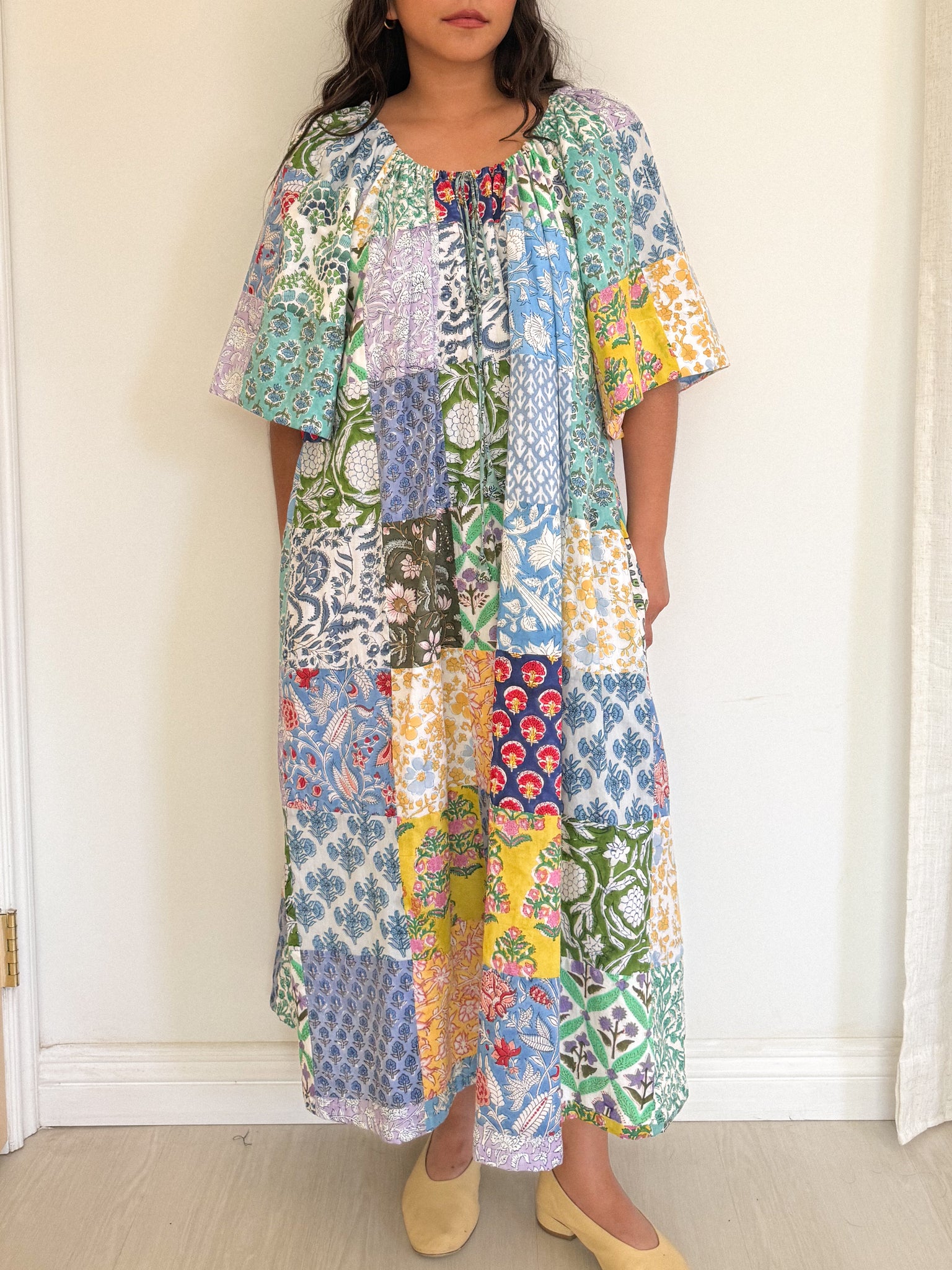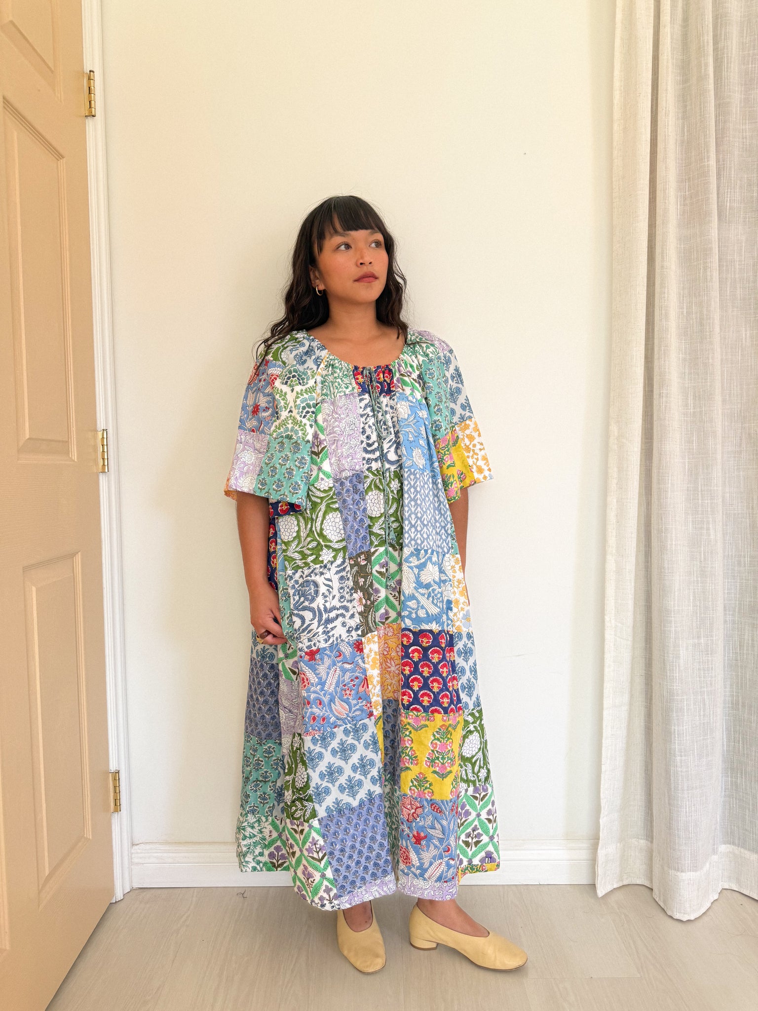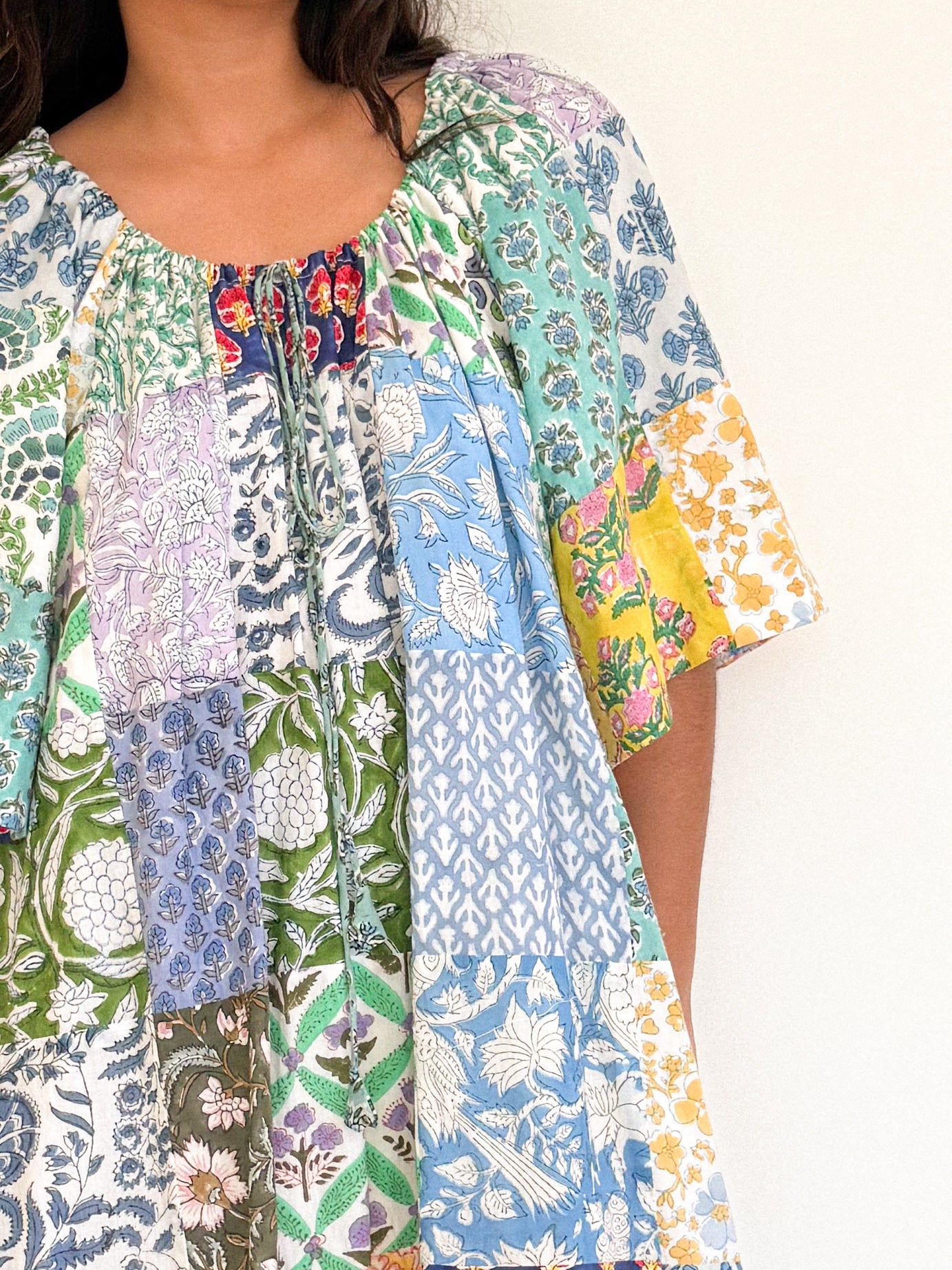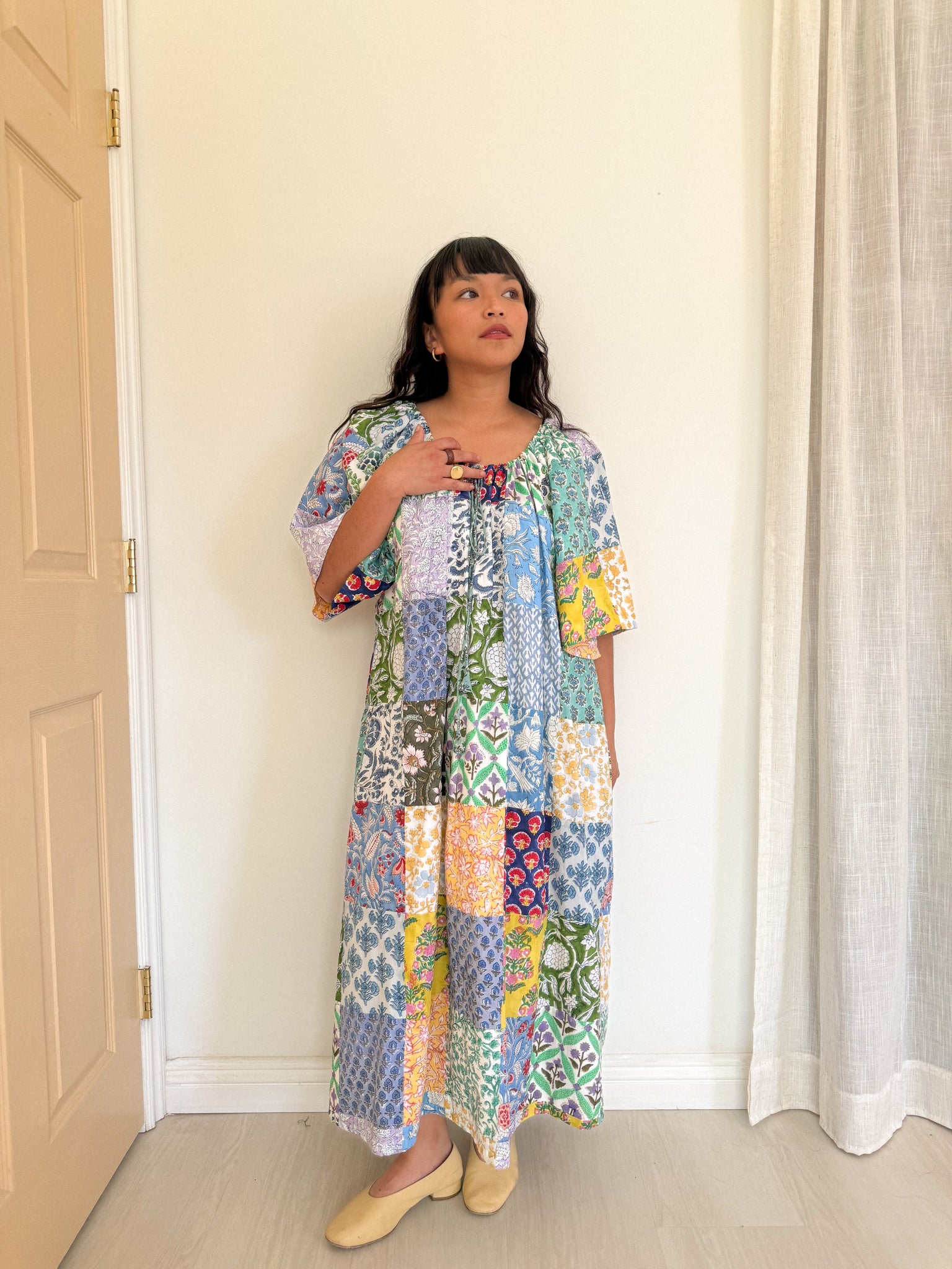 Patchwork Block Print: This has been created using leftover fabric. While all dresses in this colorway will be similar in colorful patchwork, each dress will be different given the nature of using leftover fabric. No dress will be exactly the same, and we believe this is what makes it a sweet 1/1 gift.