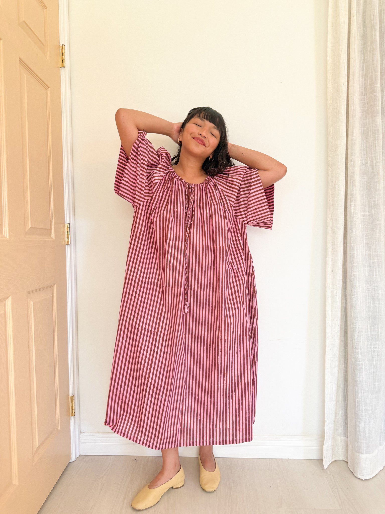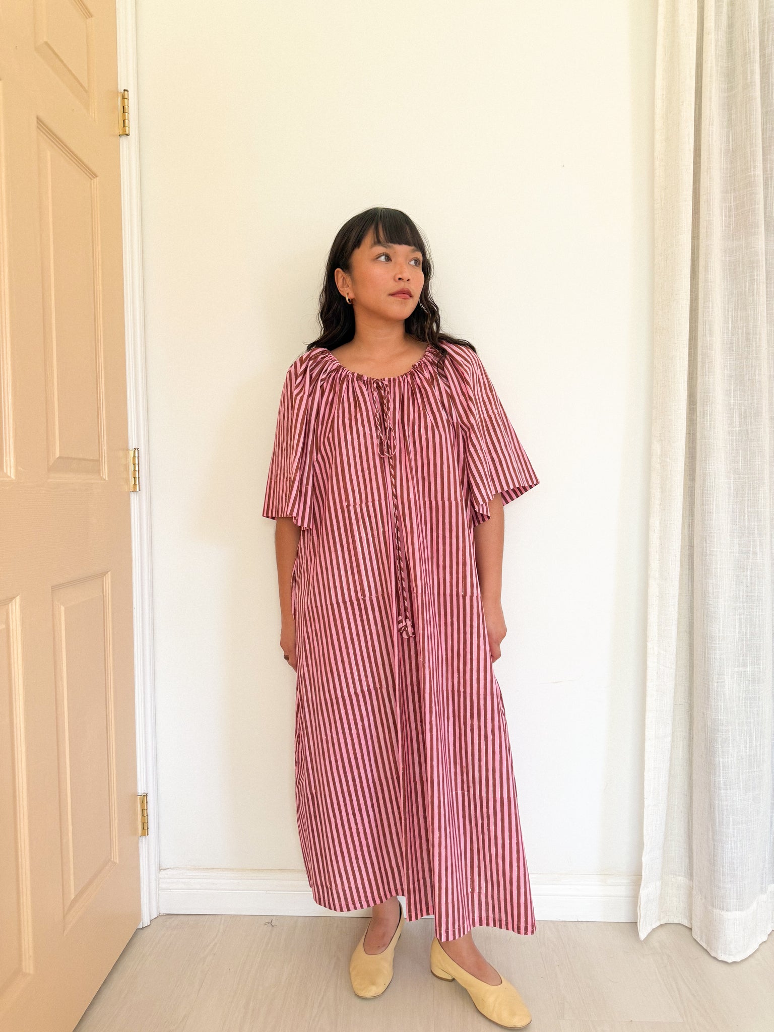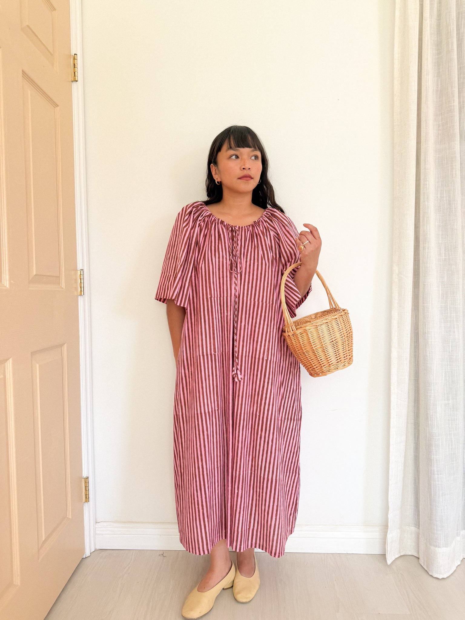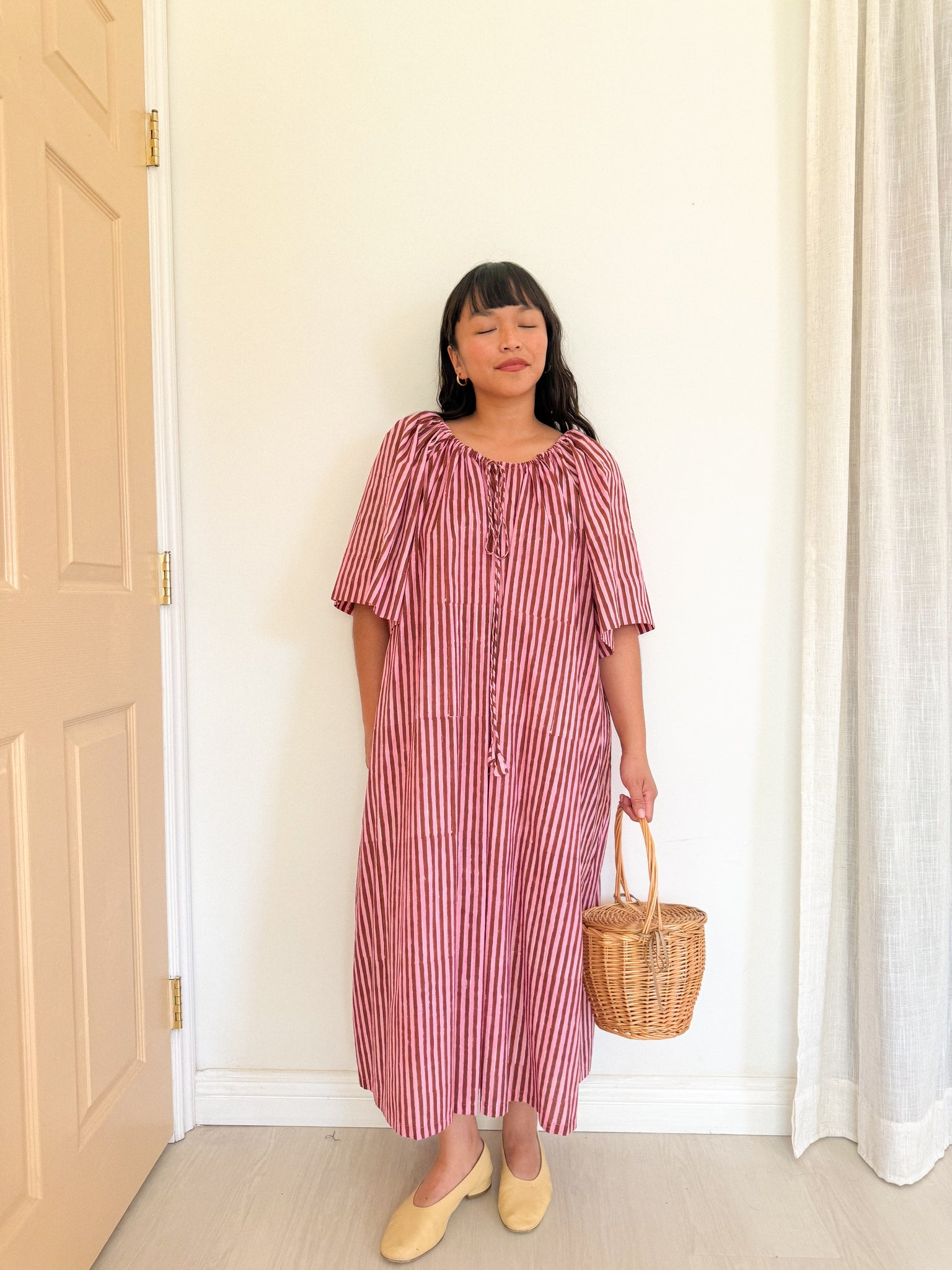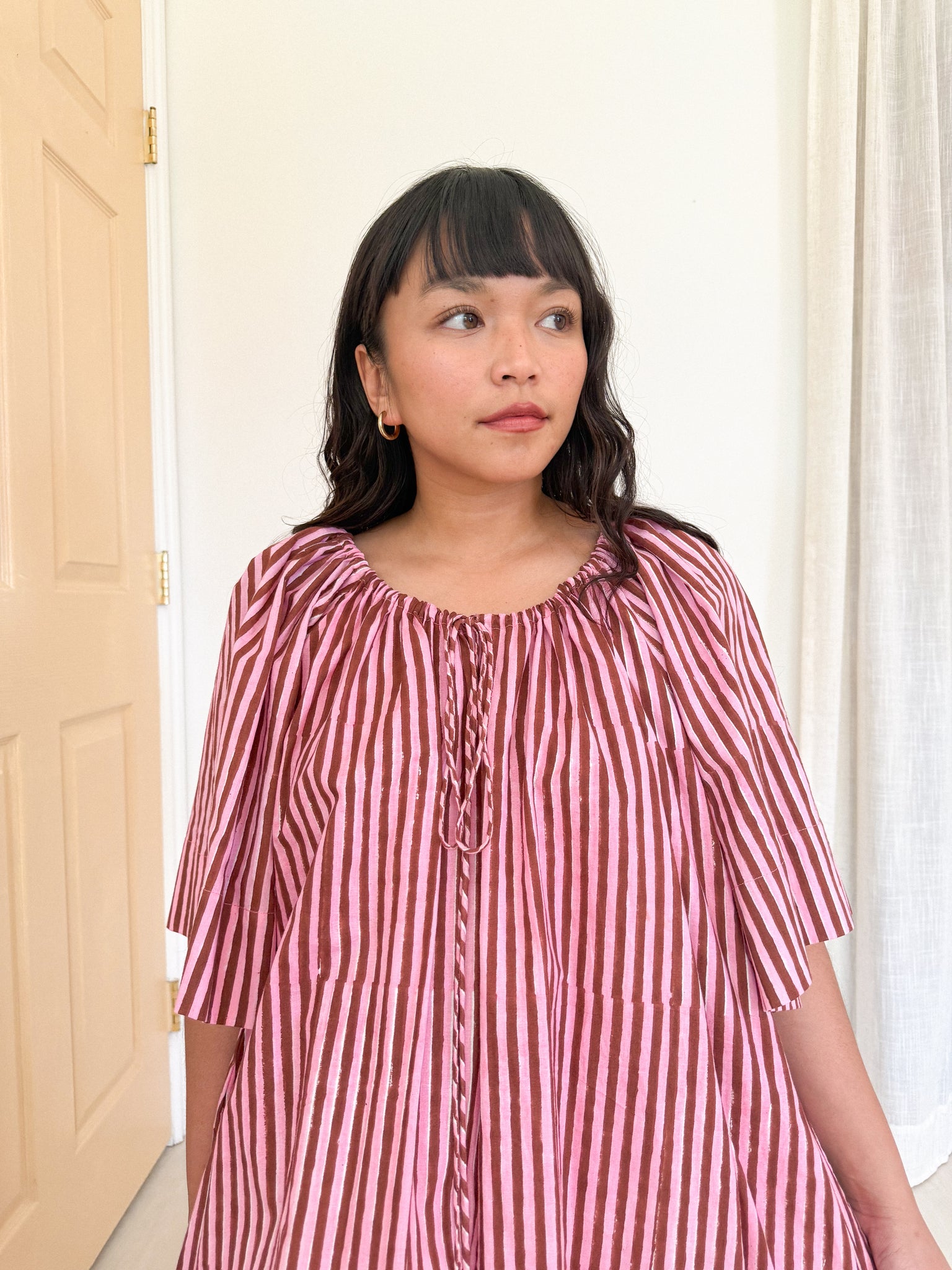Neapolitan Stripe (Pink and Brown): A custom block print done by hand just for Dancing Kind. This colorway will have variation in color and print since it is stamped by hand. We believe this adds to the beauty of this gorgeous fabric.