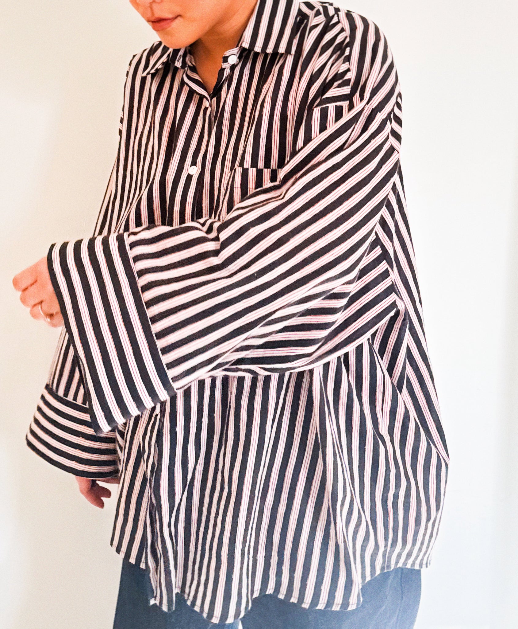 The Dancing Kind Signature Shirt is Richelle's new favorite staple of the Dancing Kind line, and it will hands down be your new favorite garment in your closet. Made out of 100% soft cotton and incredibly breathable for all seasons, it is truly the perfect "throw on and go" piece to wear on repeat. Our Signature Big Shirt has been intentionally designed with mother of pearl buttons from top to bottom and with an airy, open, voluminous silhouette. The wide sleeves give the perfect amount of statement without being too fussy, and it can easily be rolled up and buttoned securely. We are so excited for all the ways our Signature Big Shirt will be worn with love and styled on repeat forever.